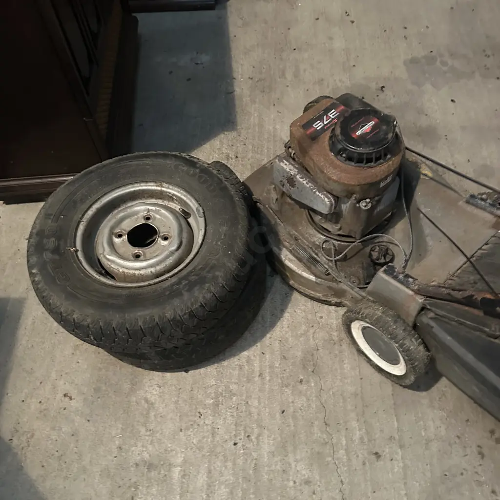 mower as is and pr of garden trailer wheels