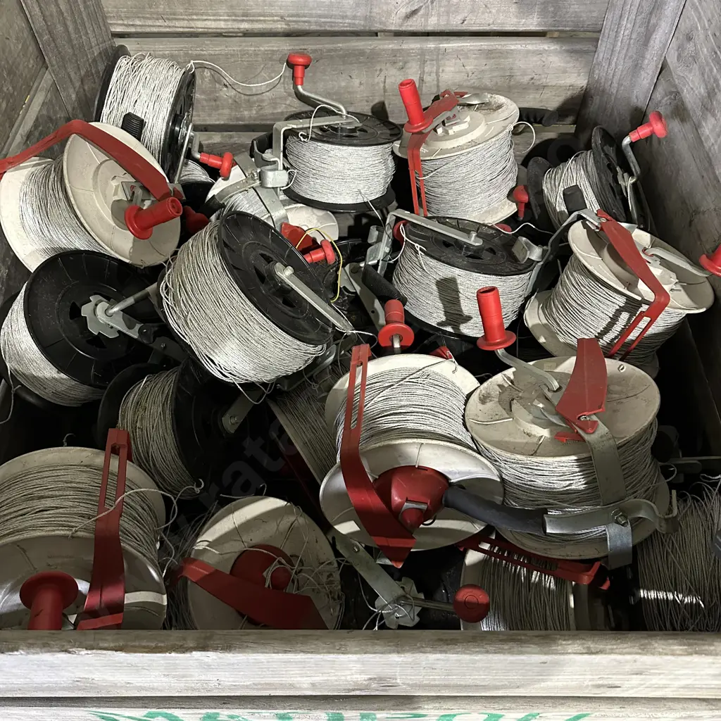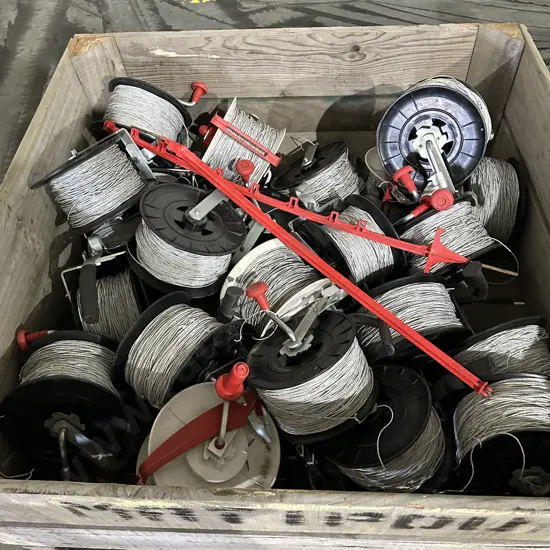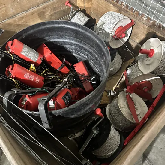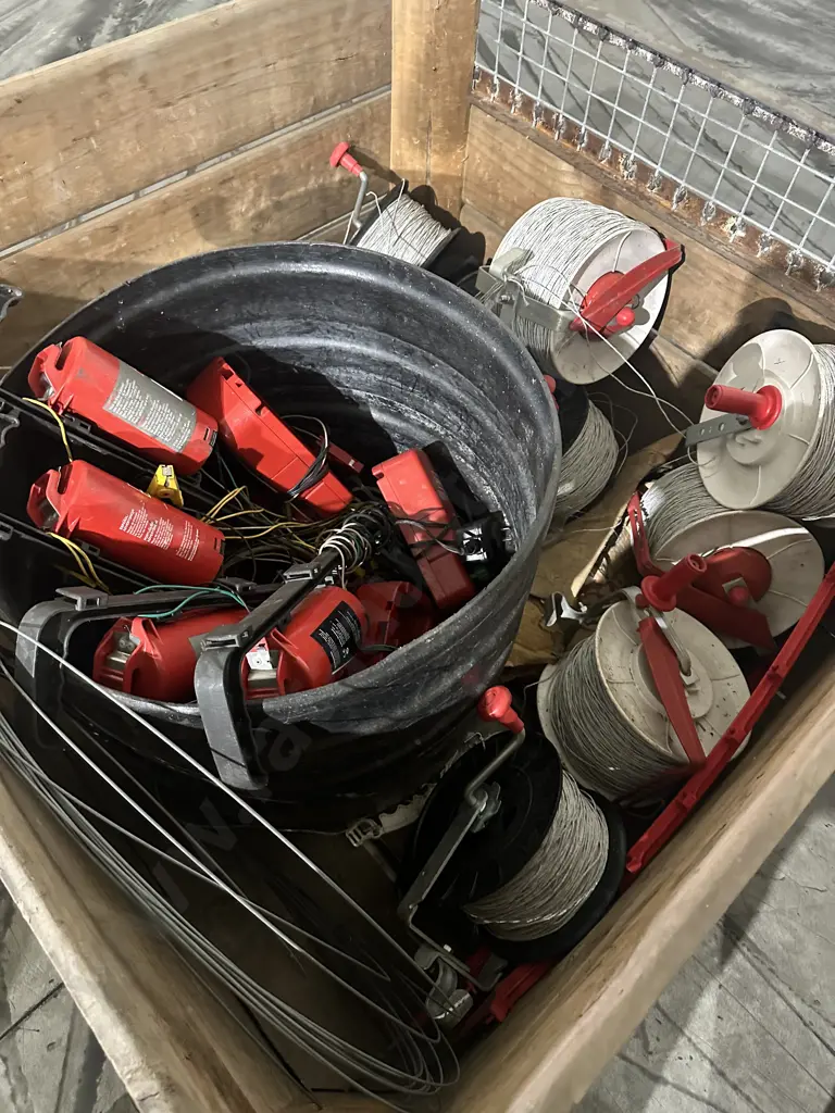 Over 50 electric fence reels, 2 bins of standards, 8 power units