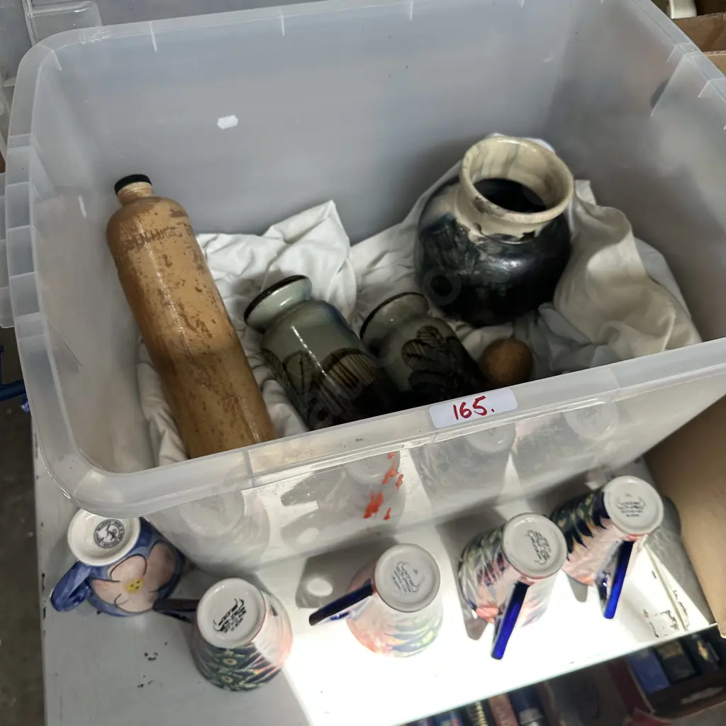 Studio cups, pottery, plastic bin