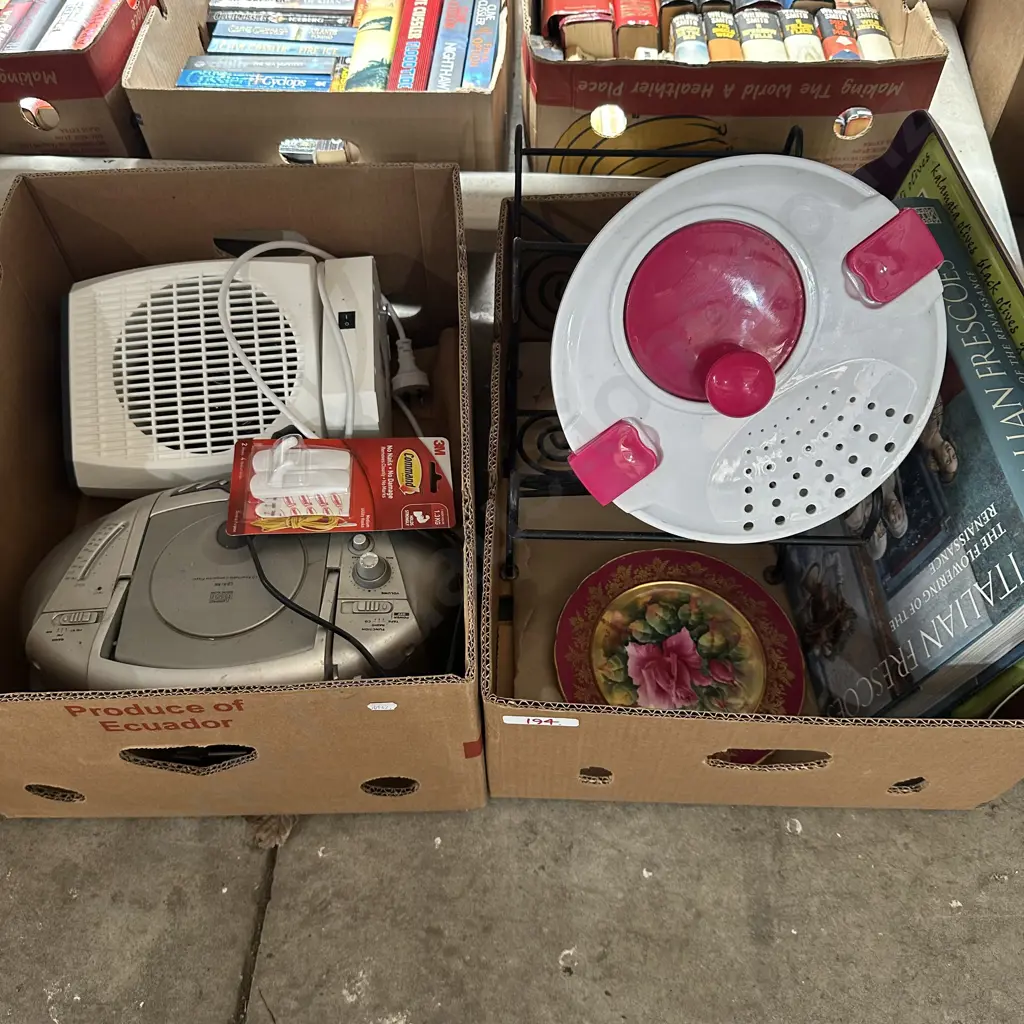 2 Boxes radio, fan heater, salad spinner, magazine rack etc