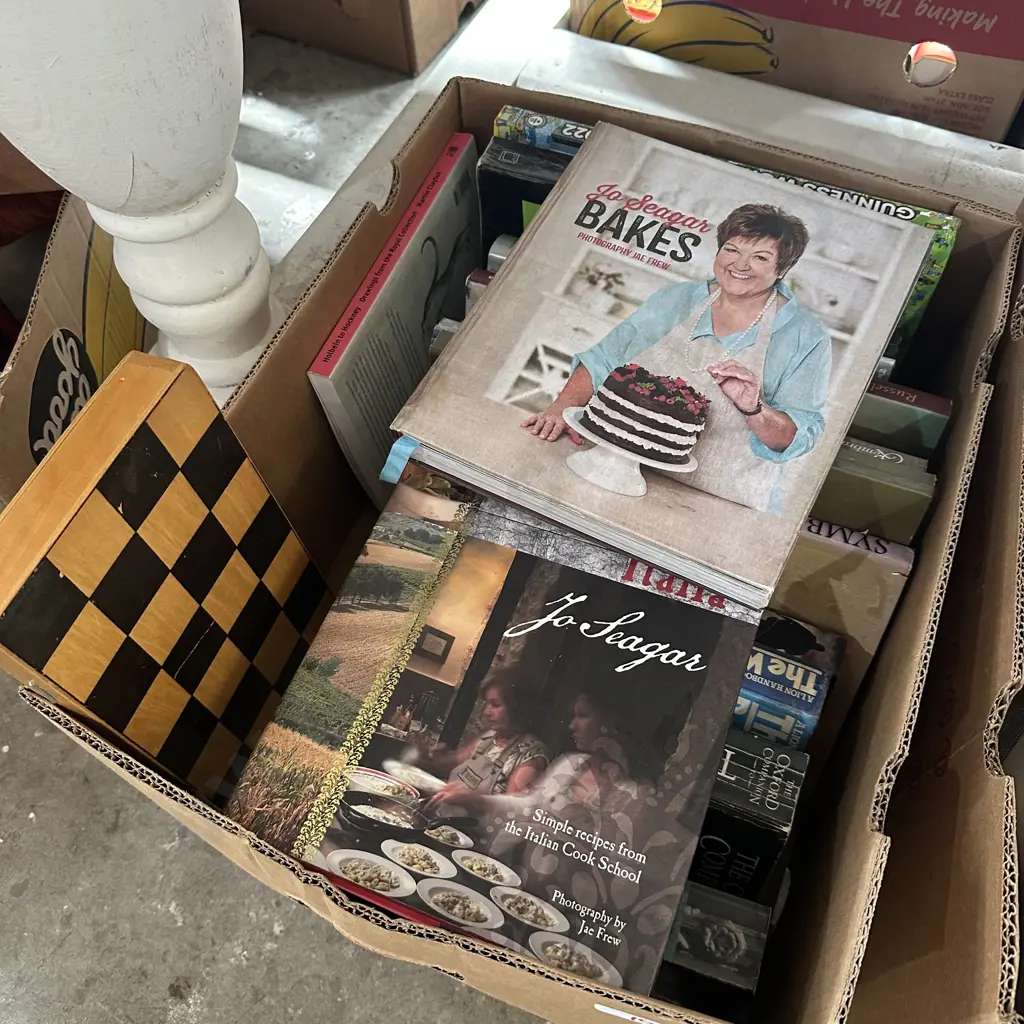 Box of books and chess set