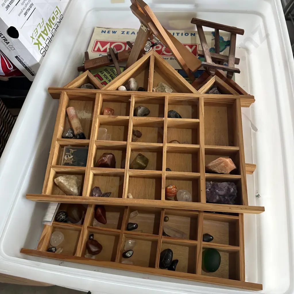 Large bin with lid, monopoly game, small easels, 2 wall shelves and contents.
